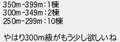 55: (東京都) [] 2021/05/11(火) 20:58:10 ID:SvreOZpp 350m-399m:1棟 300m-349m:2棟 250m-299m:10棟 やはり300m級がもう少し欲しいね http://egg.5ch.io/test/read.cgi/develop/1619665571/55