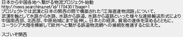 日本から中国各地へ繋がる物流プロジェクト始動 プロジェクトでは武漢と日本の関西の間で構築された江海直達物流路について 武漢を軸として水路から水路水路から鉄道水路から道路といった様な連絡輸送形式により 中国南西部北西部中原地域にまで延伸し日本との経済貿易の連係を深めるとともに ユーラシア大陸を横断して欧州へと繋がる鉄道物流網への接続を推進すると伝えた スゴいぞ関西
