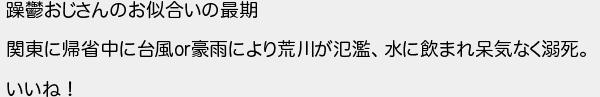 369: (光) [sage] 2022/04/05(火) 22:52:59 ID:Y9xJHfv3 躁鬱おじさんのお似合いの最期 関東に帰省中に台風or豪雨により荒川が氾濫、水に飲まれ呆気なく溺死。 いいね! http://egg.5ch.net/test/read.cgi/develop/1648314112/369