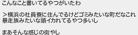 こんなこと書いてるやつがいたわ 横浜の社員寮に住んでるけどゴミみたいな町だなこれ 暴走族みたいな頭イカれてるやつ多いし まあそんな感じの街やし
