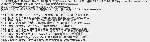 456: (Unknown) [sage] 2023/11/06(月) 16:20:52.94 ID:FMOWs+wf これは建設中・計画を含む日本の超高層ビルの高さトップ10だけど、大阪は最近250m超えの計画が無くなったよねwwwwwww 万博とかIRとか騒いでいるけどどう見ても衰退中だよねwwwwwww 悔しいのうwwwwwww東京関東が羨ましいのうwwwwwww 強がらなくていいぞプライドだけは馬鹿みたいに高い哀れな負け犬さんたちwwwwwww No.1 385m 東京トーチ トーチタワー 東京都千代田区 2028年3月竣工予定 No.2 327m 六本木五丁目西地区 A-1街区 東京都港区 2030年度竣工予定 No.3 325m 麻布台ヒルズ 森JPタワー 東京都港区 2023年竣工 No.4 300m あべのハルカス 大阪市阿倍野区 2014年竣工 ←これだけwww No.5 296m 横浜ランドマークタワー 横浜市西区 1993年竣工 No.6 288m 六本木五丁目西地区 B街区 東京都港区 2030年度竣工予定 No.7 284m 日本橋一丁目中地区 C街区 東京都中央区 2026年3月竣工予定 No.8 266m 虎ノ門ヒルズ ステーションタワー 東京都港区 2023年竣工 No.9 263m 麻布台ヒルズ レジデンスB 東京都港区 2024年6月竣工予定 No.10 262m 中野サンプラザ建て替え 東京都中野区 2028年度竣工予定 http://egg.5ch.net/test/read.cgi/develop/1698965636/456