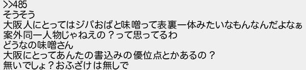 そうそう 大阪人にとってはジパおばと味噌って表裏一体みたいなもんなんだよなぁ 案外同一人物じゃねえの?って思ってるわ どうなの味噌さん 大阪にとってあんたの書込みの優位点とかあるの? 無いでしょ?おふざけは無しで