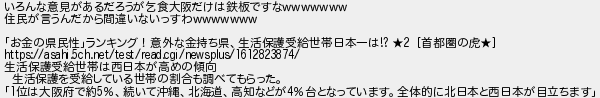588: (庭) [sage] 2023/11/10(金) 13:57:17.63 ID:r711DiQn いろんな意見があるだろうが乞食大阪だけは鉄板ですなwwwwwww 住民が言うんだから間違いないっすわwwwwwww 「お金の県民性」ランキング!意外な金持ち県、生活保護受給世帯日本一は!? ★2 [首都圏の虎★] https://asahi.5ch.net/test/read.cgi/newsplus/1612823874/ 生活保護受給世帯は西日本が高めの傾向 生活保護を受給している世帯の割合も調べてもらった。 「1位は大阪府で約5%、続いて沖縄、北海道、高知などが4%台となっています。全体的に北日本と西日本が目立ちます」 http://egg.5ch.net/test/read.cgi/develop/1698965636/588