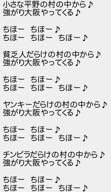 小さな平野の村の中から 強がり大阪やってくる ちほー ちほー ちほー ちほー ちほー 貧乏人だらけの村の中から 強がり大阪やってくる ちほー ちほー ちほー ちほー ちほー ヤンキーだらけの村の中から 強がり大阪やってくる ちほー ちほー ちほー ちほー ちほー チンピラだらけの村の中から 強がり大阪やってくる ちほー ちほー ちほー ちほー ちほー