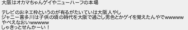 大阪はオカマちゃんゲイやニューハーフの本場 テレビのおネエ枠というのが有るがたいていは大阪人やし ジャニー喜多川は子供の頃の時代を大阪で過ごし男色とかゲイを覚えたんやで やべえなおい しゃきっとせんかーい!