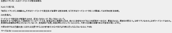 北摂のイオンモールのフードコートが無法地帯化 上に月日 地元にイオンが二店舗ある片方はフードコートで高校生が自習する無法地帯もう片方はフードコートで老人が書道してる本物の無法地帯 との投稿が フードコートで高校生が勉強するのは望ましくはないが珍しくもないという 飲食をするべき場所として提供されているテーブルを飲食以外に使用するのは他人に迷惑をかけうることを認識すべきだが書道となると異様さが際立つなぜイオンなのかなぜフードコートなのか 具体的な店舗名は明らかになっていないが投稿者は北摂在住と明らかにしていることから大阪か兵庫の店舗である可能性が高いようだ 大阪の中でもお行儀の良いとされる北摂ですらこの有り様だから大和川より南に行ったらどないなるんやろね やべえなおい