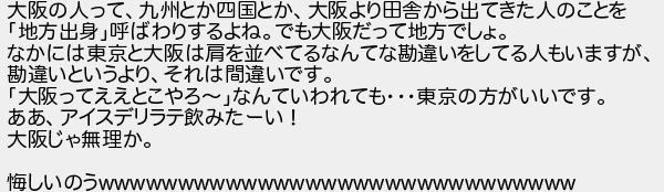 大阪の人って九州とか四国とか大阪より田舎から出てきた人のことを 地方出身呼ばわりするよねでも大阪だって地方でしょ なかには東京と大阪は肩を並べてるなんてな勘違いをしてる人もいますが 勘違いというよりそれは間違いです 大阪ってええとこやろなんていわれても東京の方がいいです ああアイスデリラテ飲みたーい! 大阪じゃ無理か 悔しいのう