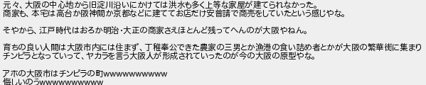 元大阪の中心地から旧淀川沿いにかけては洪水も多く上等な家屋が建てられなかった 商家も本宅は高台か阪神間か京都などに建ててお店だけ安普請で商売をしていたという感じやな そやから江戸時代はおろか明治大正の商家さえほとんど残ってへんのが大阪やねん 育ちの良い人間は大阪市内には住まず丁稚奉公できた農家の三男とか漁港の食い詰め者とかが大阪の繁華街に集まり チンピラとなっていってヤカラを言う大阪人が形成されていったのが今の大阪の原型やな アホの大阪市はチンピラの町 悔しいのう
