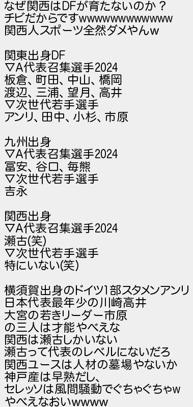 なぜ関西はが育たないのか? チビだからです 関西人スポーツ全然ダメやん 関東出身 代表召集選手 板倉町田中山橋岡 渡辺三浦望月高井 次世代若手選手 アンリ田中小杉市原 九州出身 代表召集選手 冨安谷口毎熊 次世代若手選手 吉永 関西出身 代表召集選手 瀬古笑 次世代若手選手 特にいない笑 横須賀出身のドイツ部スタメンアンリ 日本代表最年少の川崎高井 大宮の若きリーダー市原 の三人は才能やべえな 関西は瀬古しかいない 瀬古って代表のレベルにないだろ 関西ユースは人材の墓場やないか 神戸産は早熟だし セレッソは風間騒動でぐちゃぐちゃ やべえなおい