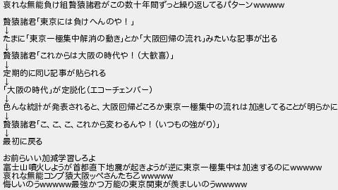 哀れな無能負け組猿諸君がこの数十年間ずっと繰り返してるパターン 猿諸君東京には負けへんのや! たまに東京一極集中解消の動きとか大阪回帰の流れみたいな記事が出る 猿諸君これからは大阪の時代や!大歓喜 定期的に同じ記事が貼られる 大阪の時代が定説化エコーチェンバー 色んな統計が発表されると大阪回帰どころか東京一極集中の流れは加速してることが明らかに 猿諸君ここここれから変わるんや!いつもの強がり 最初に戻る お前らいい加減学習しろよ 富士山噴火しようが首都直下地震が起きようが逆に東京一極集中は加速するのに 哀れな無能コンプ猿大阪ッペさんたち乙 悔しいのう最強かつ万能の東京関東が羨ましいのう