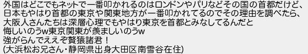 外国はどこでもネットで一番叩かれるのはロンドンやパリなどその国の首都だけど 日本もやはり首都の東京や関東地方が一番叩かれてるのでその理由を調べたら 大阪人さんたちは深層心理でもやはり東京を首都とみなしてるんだと 悔しいのう東京関東が羨ましいのう 強がらんでええぞ猿諸君! 大浜松お兄さん静岡県出身大田区南雪谷在住