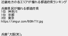 220: (ジパング) [] 2026/02/21(土) 19:29:45.26 ID:T+Q+sz1t 近畿地方の各エリアが憧れる都道府県ランキング 兵庫県民が憧れる都道府県 1位 神奈川 1位 京都 3位 東京 https://i.imgur.com/8BfnT1t.jpg 兵庫「大阪(笑)」 http://egg.5ch.net/test/read.cgi/develop/1769856442/220