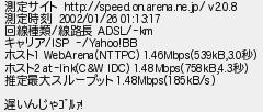 23: ー [] 02/01/26 01:14 ID:Dp4wL0Le 測定サイト http://speed.on.arena.ne.jp/ v2.0.8 測定時刻 2002/01/26 01:13:17 回線種類/線路長 ADSL/-km キャリア/ISP -/Yahoo!BB ホスト1 WebArena(NTTPC) 1.46Mbps(539kB,3.0秒) ホスト2 at-link(C&W IDC) 1.48Mbps(758kB,4.3秒) 推定最大スループット 1.48Mbps(185kB/s) 遅いんじゃゴルァ! http://mevius.5ch.net/test/read.cgi/hack/1006136833/23