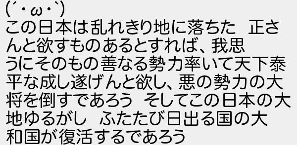 この日本は乱れきり地に落ちた 正さ んと欲すものあるとすれば我思 うにそのもの善なる勢力率いて天下泰 平な成し遂げんと欲し悪の勢力の大 将を倒すであろう そしてこの日本の大 地ゆるがし ふたたび日出る国の大 和国が復活するであろう