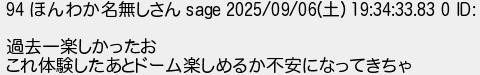 226: [sage] 2025/09/07(日) 12:29:18.96 ID:0 94 ほんわか名無しさん sage 2025/09/06(土) 19:34:33.83 0 ID: 過去一楽しかったお これ体験したあとドーム楽しめるか不安になってきちゃ http://medaka.5ch.net/test/read.cgi/honobono/1754301063/226