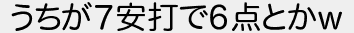 34: (ワッチョイ 69b6-3yKd [180.36.56.5]) [] 2022/09/14(水) 20:37:39.40 ID:Oojb5LyF0 うちが7安打で6点とかw http://tanuki.5ch.net/test/read.cgi/livebase/1663155288/34