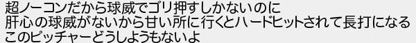 超ノーコンだから球威でゴリ押すしかないのに 肝心の球威がないから甘い所に行くとハードヒットされて長打になる このピッチャーどうしようもないよ
