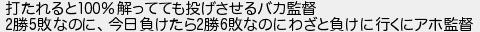 打たれると解ってても投げさせるバカ監督 勝敗なのに今日負けたら勝敗なのにわざと負けに行くにアホ監督