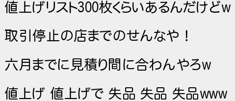 値上げリスト枚くらいあるんだけど 取引停止の店までのせんなや! 六月までに見積り間に合わんやろ 値上げ 値上げで 失品 失品 失品