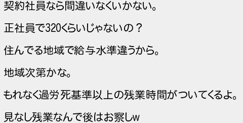 175: [sage] 2017/01/19(木) 18:32:50.42 ID:fLiRUujA 契約社員なら間違いなくいかない。 正社員で320くらいじゃないの? 住んでる地域で給与水準違うから。 地域次第かな。 もれなく過労死基準以上の残業時間がついてくるよ。 見なし残業なんで後はお察しw http://kizuna.5ch.io/test/read.cgi/peko/1214828362/175