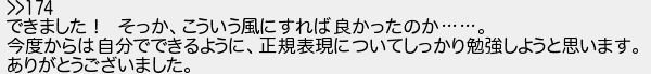 175: [sage] 04/01/25 16:27 ID:??? >>174 できました! そっか、こういう風にすれば良かったのか……。 今度からは自分でできるように、正規表現についてしっかり勉強しようと思います。 ありがとうございました。 http://tamae.5ch.net/test/read.cgi/php/1069245758/175