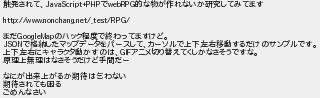 35: [sage] 2007/01/31(水) 17:57:06 ID:??? 触発されて、JavaScript+PHPでwebRPG的な物が作れないか研究してみてます http://www.nonchang.net/_test/RPG/ まだGoogleMapのハック程度で終わってますけど。 JSONで格納したマップデータをパースして、カーソルで上下左右移動するだけのサンプルです。 上下左右にキャラクタ動かすのは、GIFアニメ切り替えてくしかなさそうですな。 原理上無理はなさそうだけど手間だー なにが出来上がるか期待は乞わない 期待されても困る ごめんなさい http://medaka.5ch.net/test/read.cgi/php/1168433753/35