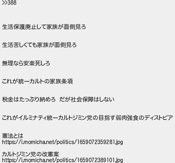生活保護廃止して家族が面倒見ろ 生活苦しくても家族が面倒見ろ 無理なら安楽死しろ これが統一カルトの家族条項 税金はたっぷり納めろ だが社会保障はしない これがイルミナティ統一カルトジミン党の目指す弱肉強食のディストピア 憲法とは カルトジミン党の改憲案