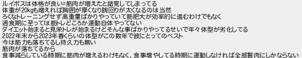 ルイボスは体格が良い筋肉が増えたと錯覚してしまってる 体重がも増えれば胸囲が厚くなり腕回りが太くなるのは当然 ろくなトレーニングせず高重量ばかりやっていて筋肥大が効率的に進むわけでもなく 過食期に至っては筋トレどころか運動自体やってない ダイエット始まると見栄トレが始まるけどそんな事ばかりやってるせいで年体型が劣化してる 年末から年春くらいの体型がこの数年で彼にとってのベスト 今は筋力も落ちてるし持久力も無い 筋肉が落ちてるから 食事減らしている時期に筋肉が増えるわけもなく食事増やしてる時期に運動しなければ全部肉にしかならない