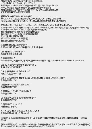1: [] 2026/04/11(土) 06:26:55.22 ID:2/qzc1q9 5年前に145kgから67kgまで痩せたルイボスさん しかし翌年には110kg以上にリバウンド 昨年はダイエットがつらくて過食を繰り返し再び約100kgに激太り 今年こそはとダイエット開始するも過食が続き半年で終了 料理に挑戦していたがすぐに飽きて今はレンチンご飯と外食三昧 すき家の特盛り2人前余裕との事 摂取カロリーは3500kcalとやや多め そんなルイボスさんの現在のダイエット方法について考察しましょう!! (痩せる保証はありませんがルイボスさんはこの方法で結果を出してます) 2024年ボディビル大会にエントリー、しかし太り過ぎのため欠場(規定体重+15kg) 2023年ボディビル大会新人の部は太り過ぎで予選落ち、同大会70kg以下級は欠場(規定体重+17kg) 2021年ベンチプレス大会にて2位入賞(参加総数2名) 数ヶ月程度のキックボクシングの経験もあり 雑誌やネットニュースなどに記事多数掲載 テレビ番組に何度も出演 (ぽかぽか、ありえへん世界等) 自叙伝も出版(KADOKAWA) Q;糖質制限しないのですか? A:筋肉にはご飯(白米)が必要です、1日5合余裕 Q:料理はしないのですか? A:飽きたので辞めました Q:健康状態は? A:血圧147〜、高脂血症、尿蛋白、腹囲95cmで痛風で鬱ですが医者からは健康と言われてます Q:どうしてコメントを削除するのですか? A:消したという証拠は? Q:お仕事は何をしてるのですか? A:インフルエンサーです Q:ボディビル大会で優勝すると言ってましたよね? 棄権ってどういう事? A:過食のせいです Q:映像はヤセ加工してますよね? A:過食のせいです Q:何度もリバウンドしてますよね? A:過食のせいです Q:「ポエプル」ってどういう意味ですか? A:過食のせいです Q:痛風はどうなったの? A:全然治りません Q:どうして大量のプリンを一気飲みしたの? A:過食の辛さを知ってほしかった ※他のYouTuber等(特にお散歩でーぷ笑とかいう醜い身体の無名ゴミカス雑魚)の話題一切禁止 前スレ 【新たな壁破り】パニック障害という難病に見事打ち克ったルイボス式ダイエット137日目【社会復帰へ】 https://rio2016.5ch.io/test/read.cgi/shapeup/1774961659 http://rio2016.5ch.io/test/read.cgi/shapeup/1775856415/1