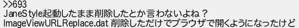 696: [sage] 2019/07/15(月) 20:09:32.69 ID:5hA6D3YW0 >>693 JaneStyle起動したまま削除したとか言わないよね? ImageViewURLReplace.dat 削除しただけでブラウザで開くようになったけど http://egg.5ch.net/test/read.cgi/software/1551951740/696