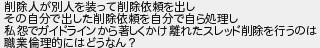 削除人が別人を装って削除依頼を出し その自分で出した削除依頼を自分で自ら処理し 私怨でガイドラインから著しくかけ離れたスレッド削除を行うのは 職業倫理的にはどうなん?