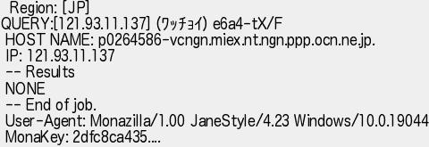 293: [sage] 2022/09/30(金) 15:36:06.54 ID:wUC+M3ox0 Region: [JP] QUERY:[121.93.11.137] (ワッチョイ) e6a4-tX/F HOST NAME: p0264586-vcngn.miex.nt.ngn.ppp.ocn.ne.jp. IP: 121.93.11.137 -- Results NONE -- End of job. User-Agent: Monazilla/1.00 JaneStyle/4.23 Windows/10.0.19044 MonaKey: 2dfc8ca435.... http://egg.5ch.net/test/read.cgi/software/1663751940/293