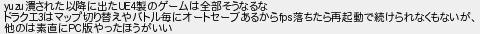 877: 警備員[Lv.4][新芽] (ワッチョイ 9711-5Qoq) [sage] 2024/11/30(土) 13:06:20.82 ID:XMAdq7Kd0 yuzu潰された以降に出たUE4製のゲームは全部そうなるな ドラクエ3はマップ切り替えやバトル毎にオートセーブあるからfps落ちたら再起動で続けられなくもないが、 他のは素直にPC版やったほうがいい http://egg.5ch.net/test/read.cgi/software/1728362194/877