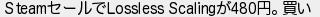 421: [sage] 2025/06/29(日) 18:35:14.46 ID:NJaMFRk70 SteamセールでLossless Scalingが480円。買い http://egg.5ch.net/test/read.cgi/software/1747921935/421