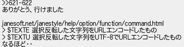 624: 警備員[Lv.4][新芽] [sage] 2025/09/20(土) 04:59:33.83 ID:TW/zArv30 >>621-622 ありがとう、行けました janesoft.net/janestyle/help/option/function/command.html > $TEXTE 選択反転した文字列をURLエンコードしたもの > $TEXTU 選択反転した文字列をUTF-8でURLエンコードしたもの なるほど・・ http://egg.5ch.net/test/read.cgi/software/1748441663/624