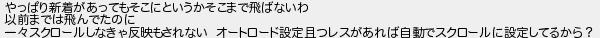やっぱり新着があってもそこにというかそこまで飛ばないわ 以前までは飛んでたのに 一スクロールしなきゃ反映もされない オートロード設定且つレスがあれば自動でスクロールに設定してるから?