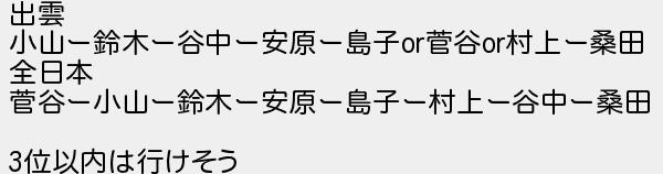 出雲 小山ー鈴木ー谷中ー安原ー島子菅谷村上ー桑田 全日本 菅谷ー小山ー鈴木ー安原ー島子ー村上ー谷中ー桑田 位以内は行けそう