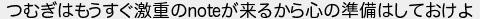 785: 名無しさん@お腹いっぱい。 (ワッチョイ 2eed-YPA5) [] 2021/01/04(月) 01:30:13 ID:6v0afmUX0 つむぎはもうすぐ激重のnoteが来るから心の準備はしておけよ http://egg.5ch.net/test/read.cgi/streaming/1609006708/785