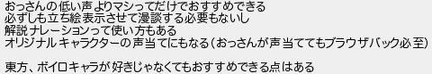 おっさんの低い声よりマシってだけでおすすめできる 必ずしも立ち絵表示させて漫談する必要もないし 解説ナレーションって使い方もある オリジナルキャラクターの声当てにもなるおっさんが声当ててもブラウザバック必至 東方ボイロキャラが好きじゃなくてもおすすめできる点はある