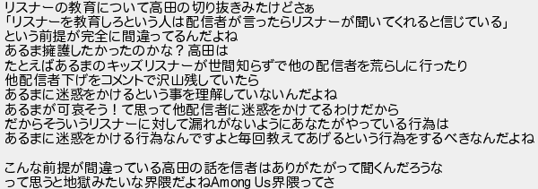 リスナーの教育について高田の切り抜きみたけどさぁ リスナーを教育しろという人は配信者が言ったらリスナーが聞いてくれると信じている という前提が完全に間違ってるんだよね あるま擁護したかったのかな?高田は たとえばあるまのキッズリスナーが世間知らずで他の配信者を荒らしに行ったり 他配信者下げをコメントで沢山残していたら あるまに迷惑をかけるという事を理解していないんだよね あるまが可哀そう!て思って他配信者に迷惑をかけてるわけだから だからそういうリスナーに対して漏れがないようにあなたがやっている行為は あるまに迷惑をかける行為なんですよと毎回教えてあげるという行為をするべきなんだよね こんな前提が間違っている高田の話を信者はありがたがって聞くんだろうな って思うと地獄みたいな界隈だよね 界隈ってさ