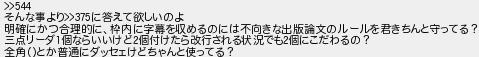 545: (ブーイモ MMff-1ycQ) [sage] 2022/06/13(月) 14:03:41.17 ID:OdBekH/XM >>544 そんな事より>>375に答えて欲しいのよ 明確にかつ合理的に、枠内に字幕を収めるのには不向きな出版論文のルールを君きちんと守ってる? 三点リーダ1個ならいいけど2個付けたら改行される状況でも2個にこだわるの? 全角()とか普通にダッセェけどちゃんと使ってる? http://egg.5ch.io/test/read.cgi/streaming/1654417455/545