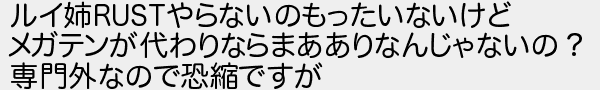 349: [sage] 2022/09/14(水) 10:01:22.67 ルイ姉RUSTやらないのもったいないけど メガテンが代わりならまあありなんじゃないの? 専門外なので恐縮ですが http://egg.5ch.net/test/read.cgi/streaming/1663115010/349