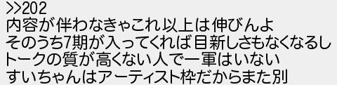 内容が伴わなきゃこれ以上は伸びんよ そのうち期が入ってくれば目新しさもなくなるし トークの質が高くない人で一軍はいない すいちゃんはアーティスト枠だからまた別