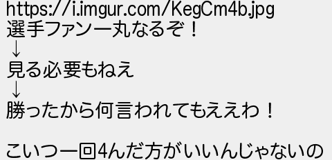 選手ファン一丸なるぞ! 見る必要もねえ 勝ったから何言われてもええわ! こいつ一回んだ方がいいんじゃないの