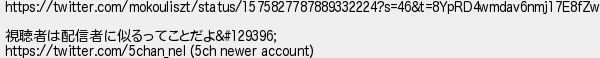 874: (ワッチョイW b711-8V4y) [] 2022/09/30(金) 21:42:56.21 ID:htulbX1r0 https://twitter.com/mokouliszt/status/1575827787889332224?s=46&t=8YpRD4wmdav6nmj17E8fZw 視聴者は配信者に似るってことだよ🥴 https://twitter.com/5chan_nel (5ch newer account) http://egg.5ch.net/test/read.cgi/streaming/1663195435/874