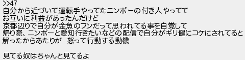自分から近づいて運転手やってたニンポーの付き人やってて お互いに利益があったんだけど 京都辺りで自分が金魚のフンだって思われてる事を自覚して 帰り際ニンポーと愛知行きたいなどの配信で自分がギリ健にコケにされてると 解ったからあたりが 怒って行動する動機 見てる奴はちゃんと見てるよ