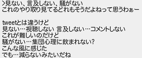 見ない言及しない騒がない これのやり取り見てるどれもそうだよねって思うわぁー とは違うけど 見ない視聴しない 言及しないコメントしない これが難しいのだけど 騒がない集団心理に飲まれない こんな風に感じた でも減らないみたいだね