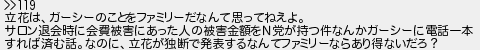 121: (ワッチョイ ff6e-8/5L) [] 2022/09/17(土) 10:42:00.83 ID:heSlmgyF0 >>119 立花は、ガーシーのことをファミリーだなんて思ってねえよ。 サロン退会時に会費被害にあった人の被害金額をN党が持つ件なんかガーシーに電話一本 すれば済む話。なのに、立花が独断で発表するなんてファミリーならあり得ないだろ? http://egg.5ch.net/test/read.cgi/streaming/1663276565/121