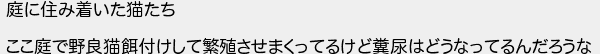 庭に住み着いた猫たち ここ庭で野良猫餌付けして繁殖させまくってるけど糞尿はどうなってるんだろうな