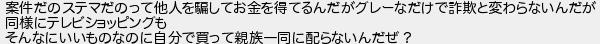 案件だのステマだのって他人をしてお金を得てるんだがグレーなだけで詐欺と変わらないんだが 同様にテレビショッピングも そんなにいいものなのに自分で買って親族一同に配らないんだぜ?